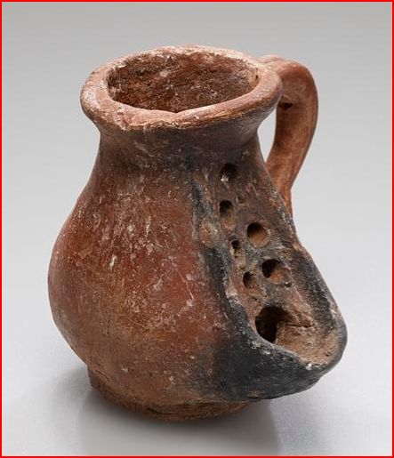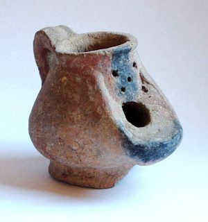 But here's the conundrum that has puzzled scholars: Not only does a chamber that rises far higher than the fuel level dictated by the lowly placed nozzle seem completely pointless, the upper part of the chamber is riddled with holes. What on earth is the point of adding an apparently useless perforated extension above the fuel chamber of a lamp? Could the object have been used as a burner to produce smoke (e.g. as insect repellent)? No, the function I propose may have helped to discourage insects but not through the application of smoke. While carbon residue around the nozzle proves use of a flame there, that around the holes above it is merely secondary and there are no burn marks inside the vessel itself. In addition, that scenario would not explain why all the holes are concentrated in only one place. Could the object have doubled as some kind of filter or sprinkler? No, but it is likely that the object did perform two roles and it is those holes that give the best clue to the object's true probable purpose. While the bottom part of the chamber would have contained liquid fuel (such as olive oil) for the lamp to function, the part above the nozzle clearly did not. The contents of the upper part would need to be a relatively dry and solid substance. That substance was almost certainly incense. Incense was used not only for religious and other formal occasions at public locations in the ancient world, it also played a traditional role in the domestic environment where it was commonly heated at household shrines, valued for its supposed medicinal properties or simply employed as an aromatic amenity. If the upper part of the chamber was intended to hold incense, why are there no burn marks inside it? Incense does not always need to be literally burnt to be effective. Merely heating it is sometimes a preferable alternative. Slow, gentle heating not only avoids the smell of charring and the discomfort of smoke, it releases the fragrance of the incense over a much longer period. The concept is still practised today. How did the fuel and incense stay separate if they shared the same chamber? It is important to bear in mind that these lamps tend to be very small (typically only 4 to 6 centimetres in diameter) and it was apparently not thought necessary - or even desirable - to create a physical barrier between the fuel and the incense. The liquid fuel would naturally sink to the bottom of the chamber and, as found in modern practice, lumps or pellets of incense heated on top of a bed of olive oil produce a harmonious aromatic blend. Okay, so why the holes when any aroma would have vented perfectly well through the open top of the chamber anyway? As I said, it is the holes that give the best clue to the object's probable purpose. But it is easy to misunderstand the reason for them. Confusion can be caused by incorrect assumptions about the direction of flow. I suspect the holes were not created primarily to let aroma out; they were created to let heat in. Pottery is a poor conductor. The body of a pottery lamp does not become warm enough to have much effect on any incense placed inside it. The heat would be provided by the flame on the outside of the lamp - which is why all the holes are concentrated in only one place, directly above a scoop-sided wick-hole deliberately located as close to them as possible. The holes allowed the heat from the flame to reach the incense. Conclusion: The objects would thus serve as both lamps and censers. Though not always immediately obvious to the modern eye, ancient technology could be quite ingenious.