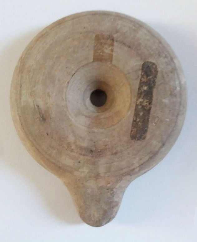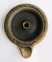 A distinctive feature of ancient Greek pottery lamps is the conical tube that began appearing in the centre of many of them towards the end of the 7th century BC. Its use has intrigued scholars for many years and various theories have been proposed. At first, it seemed obvious that the lamps were designed to "fit on a peg" [1] or were mounted on the tapered spike of a stand. However, it was pointed out that such an arrangement would be "unstable" [2], some of the tubes are too angled or narrower at the bottom than at the top, and, crucially, examples of the tubes did not show any traces of the wear that would be expected on the inside. In short, although the tube may have sometimes allowed lamps to be mounted on a spike, that is unlikely to have been its primary function. |