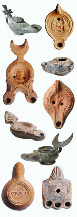 silver, bronze, iron, lead, stone, glass and clay. Pottery lamps are by far the commonest survivals and it is by
